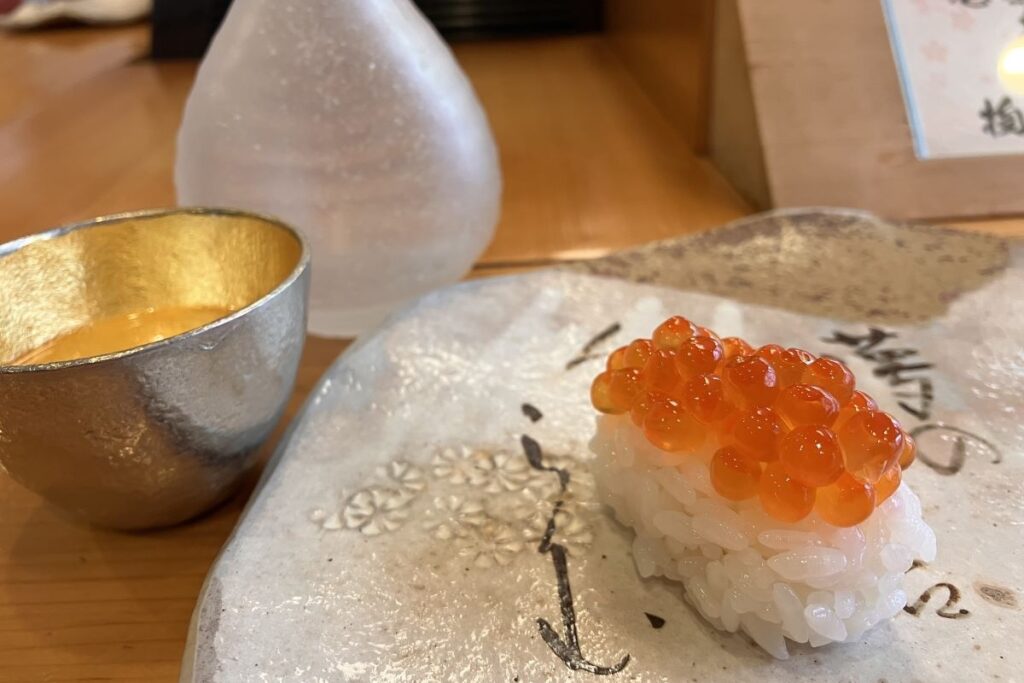 イクラも軍艦ではなく、握りで。しょうゆで漬けてありますが、ネタにしても崩れないよう水分を調節され、ご飯の上からぽろぽろ落ちてくることはありません。卵かけご飯のようなまろやかな味わいで、皮もまったく口に残りません。