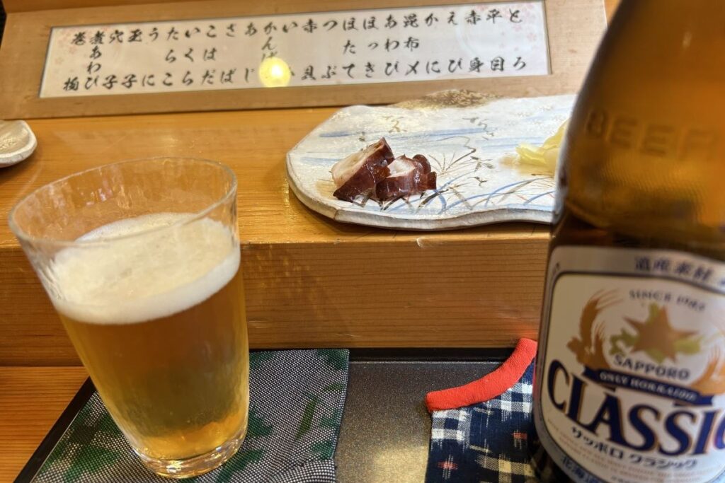 半分まできたところで、2021年に函館に54年ぶりとなる酒蔵として創設された上川大雪酒造「五稜の蔵」の「五稜」の純米酒をお願いします。日本酒は全国の銘酒10種類ほどを置いており、その時々で銘柄は変わりますが、函館に地元のコメや水を使う蔵ができてから、五稜と札幌・千歳鶴の「十一州」だけは常備しているそうです。