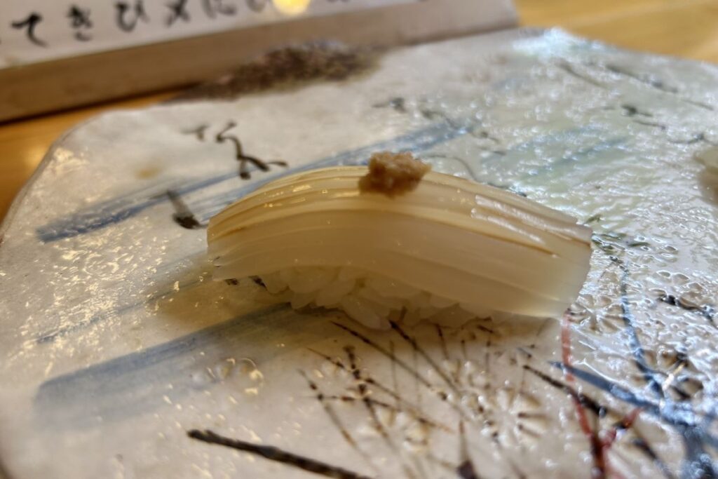 ホッキはさっとあぶって塩で。ピンク色の貝は弾力があり、あぶった香ばしさはありますが、中は半生。これ以上火を入れると固くなる寸前です。「つまみに生で出してコリコリ感を味わってもらった後、後であぶりの握りを出すなど、同じ食材を2度楽しんでもらえます」と言います。