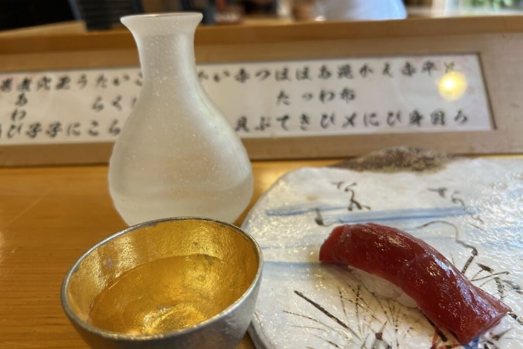 ビールも頼むと、金丸さんがさっと煮タコを切ってくれました。ほうじ茶でゆでたタコで、とても柔らかく煮上がっています。握りの1貫目はヒラメ。かぼすと塩が振ってあります。昆布締めかと思うほどにうまみが強く、身がねっとりとしています。金丸さんは「活け締めにした後、あえて一晩寝かせて、魚のうまみを引き出しました」と言います。2貫目の本マグロの中トロは煮きり醤油で。しゃりは小さめで、口の中でほろりとほどけます。見た感じ以上にネタが厚く、食べ応えがあります。