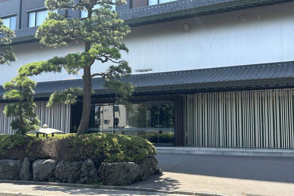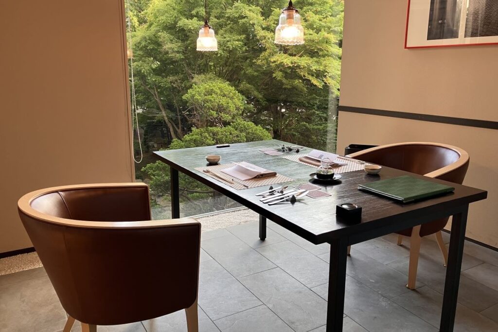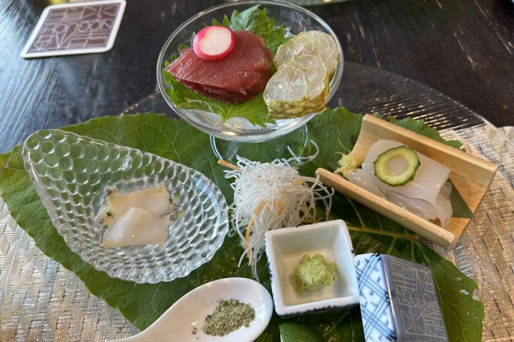 お楽しみの夕食はホテルの和モダン創作会席です。2階には「お食事処」としてテーブルや掘りごたつの個室があり、このうち中庭の見える「CHIKURIN」の席を用意してくれました。望楼NOGUCHI函館は地元をはじめ、道南の季節の食材を使うことを心がけており、献立表にはできるだけ産地を記載するようにしているそうです。和食と洋食の料理長がそれぞれいて、春夏秋冬ごとに年4回、季節のコースを組み立てます。この日は夏のコースです。
