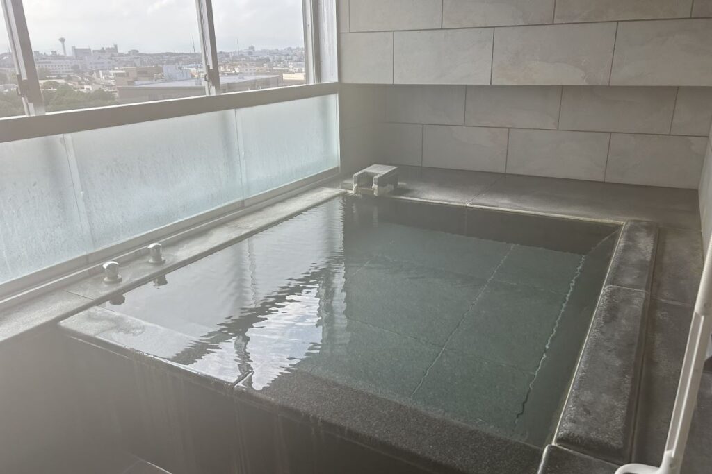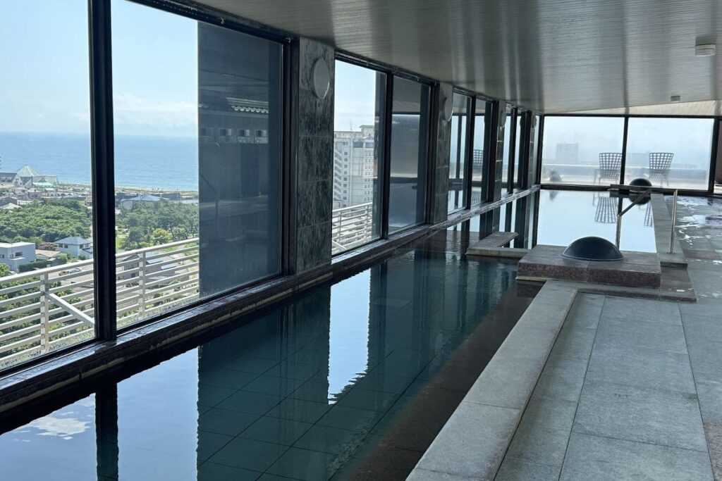 大浴場に行ってみましょう。お湯は少し熱めの無色透明で、しっとりとした肌触り。塩分濃度が高めで、潮風のような香りがします。体の芯から温まり、湯冷めしにくいのが特徴だそうです。