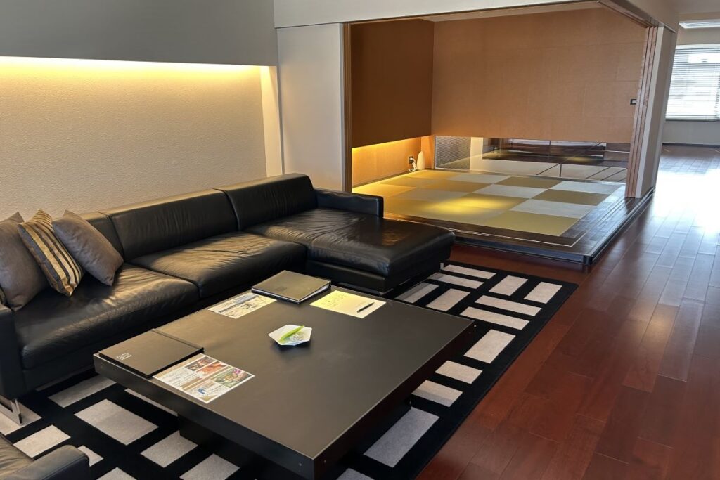 リビングには広々したソファセットと大きなテレビ、床に座ったり寝転んだりしてくつろげるたたみのスペースがあります。寝室にはベッドが2台。空気清浄機や美容用のスチーマーも備えられています。バーカウンターには豆からひくコーヒーとミル、お茶類のセットがあり、冷蔵庫の中のビールやお茶も無料です。