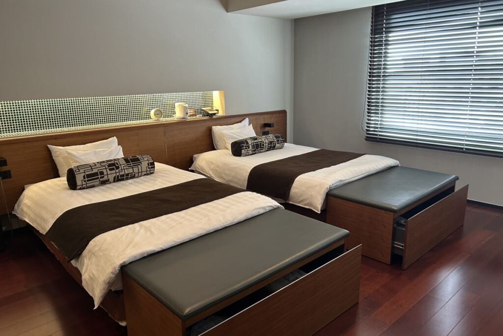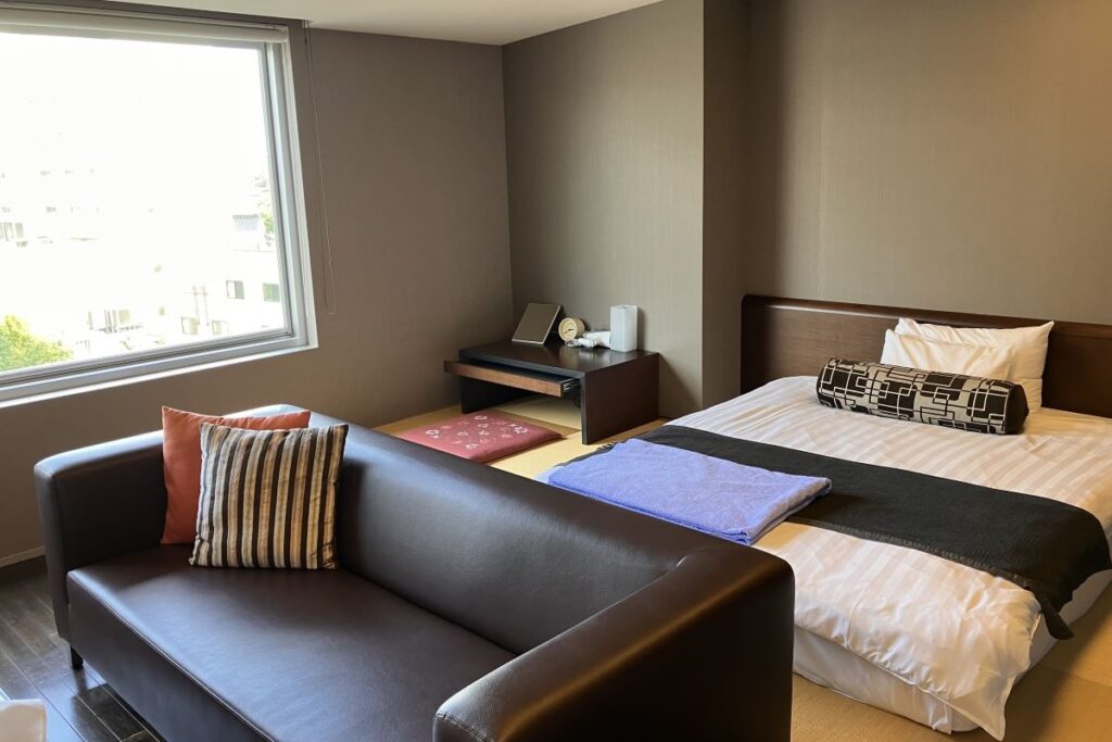 望楼NOGUCHI函館には、おひとりさま向けの部屋もワンフロア、19室あります。広いリビングにはゆったりしたソファセット、たたみ敷きの小上がりには大きなベッドがあります。温泉地では、ツインやグループ泊向けの和室などが多いなか、1人でも気兼ねなく宿泊できる部屋があるのは、うれしいですね。