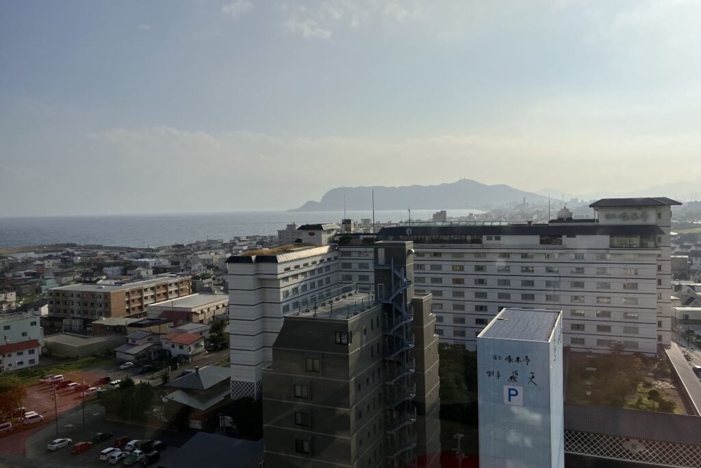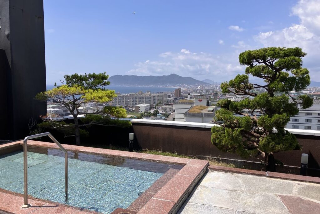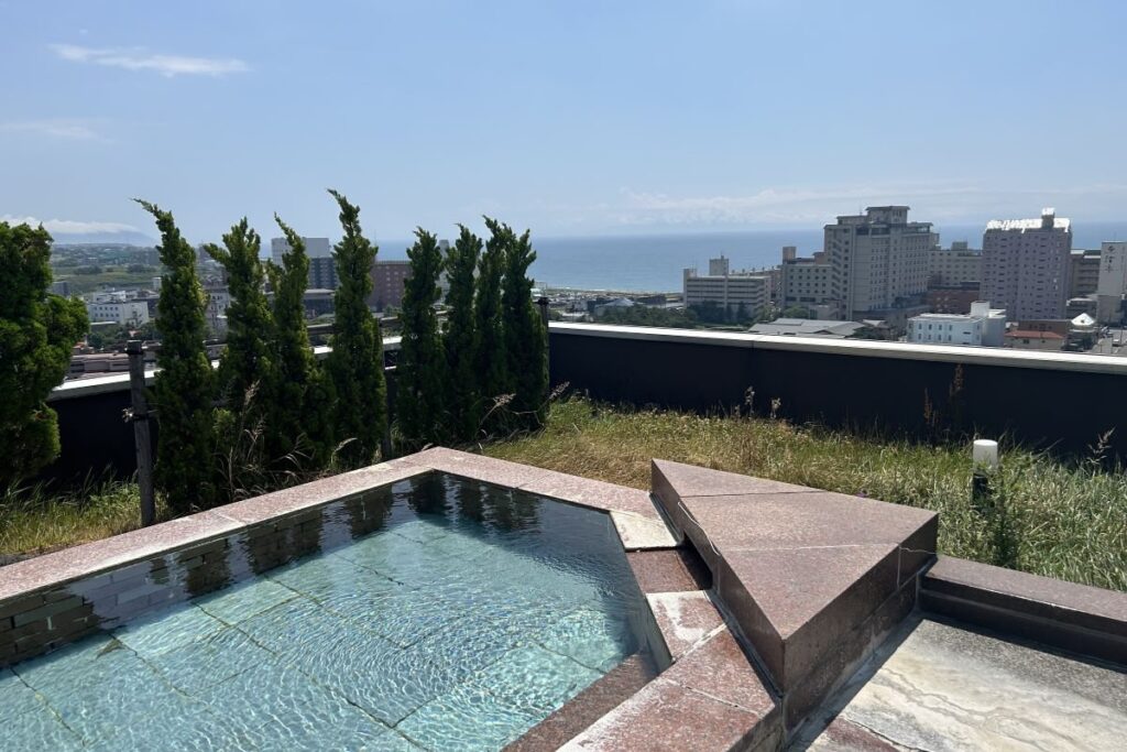 本日の宿泊は、湯の川温泉にある「望楼NOGUCHI函館」。79室の客室のうち、半分がメゾネットタイプのスイートで、スイートを含めた7割の客室に展望風呂が付いています。最上階の13階には大浴場があり、露天風呂の男湯からは箱館山を、女湯からは函館空港の滑走路や海を眺めることができます。
