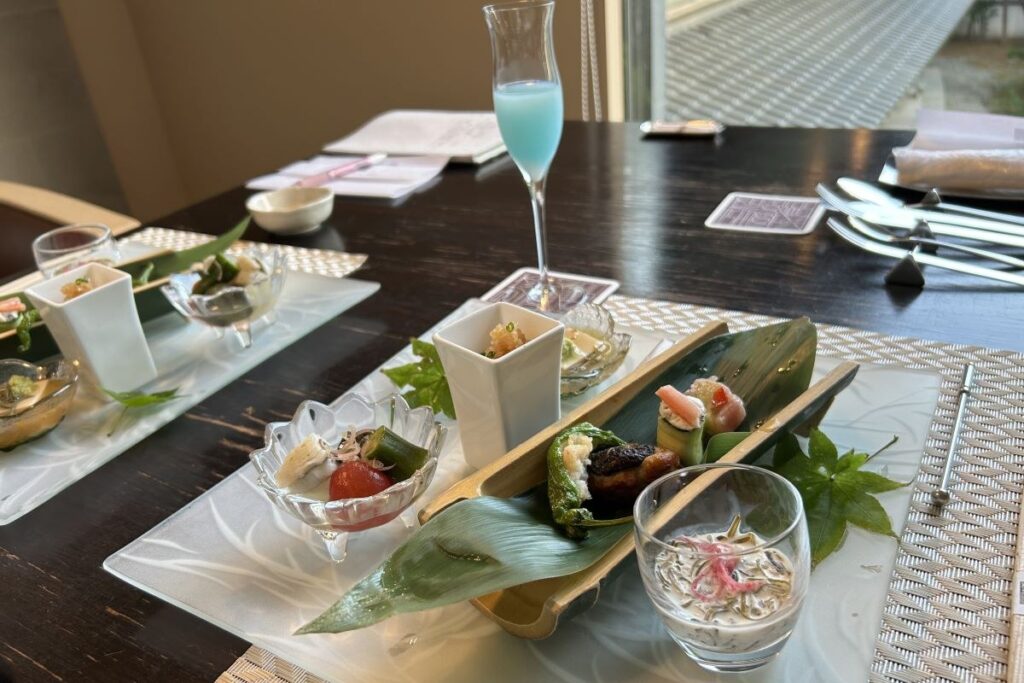 カルピスやウオッカを使い、ブルーキュラソーシャーベットで仕上げた食前酒「朝曇」と前菜の盛り合わせ「歓迎の一皿~山海の幸」でスタートです。八雲産真フグのちり酢和えや道産のパプリカや枝豆などと生ハムのゼリー寄せなど7品が涼しげなガラスの大皿に集められています。自家製ウニ豆腐は、濃厚なウニ豆腐をわさびとジュンサイと合わせ、さっぱりと食べられます。