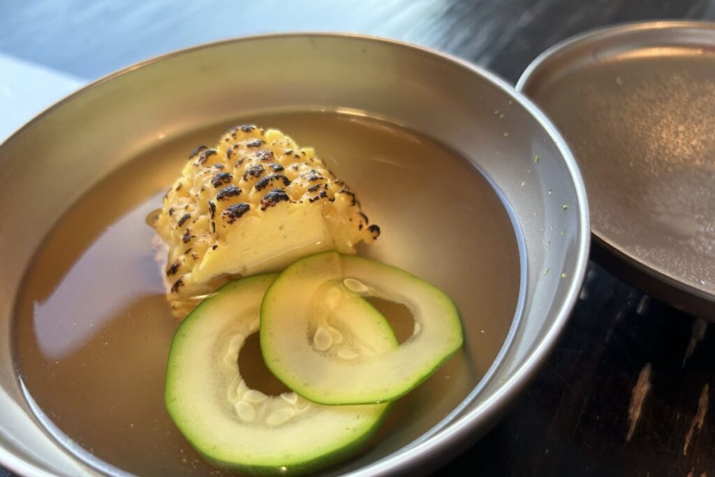 「北海道産とうもろこし真丈」は、焼とうもろこしを模したしんじょのお椀。焦げ目まで付いて、本物そっくりのすり身の中に、プチプチととうもろこしの実が入っており、上品な昆布だしが実の甘さを引き立てます。お造りは「函館産蝦夷アワビの水貝」など4品を盛り合わせ。「函館産朝捕れ真イカ」はおろししょうがをたっぷり付け、イカ刺し専用のしょうゆで、「海峡産本マグロ」はがごめ昆布のしょうゆで、刺身をおぼろ昆布でくるんだ「戸井産ヒラメの龍皮巻き」は海藻入りの「海峡塩」で、それぞれいただきます。