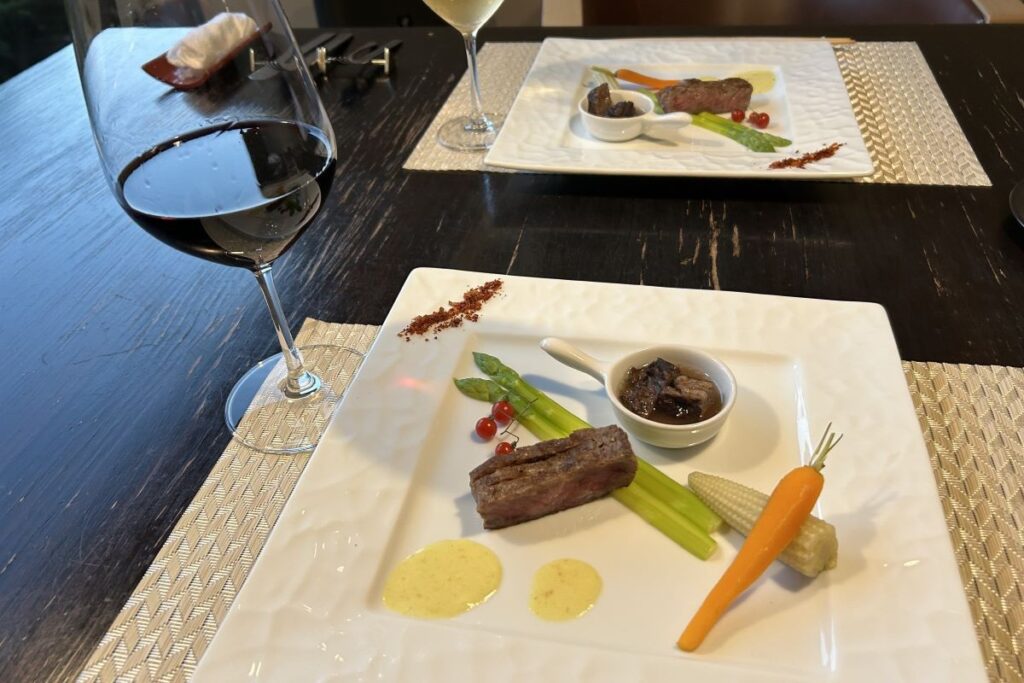 メーンは魚料理と肉料理が一皿ずつ。「噴火湾アブラガレイと海老の湯葉巻きクロスタ」はカレイとエビのすり身を湯葉で巻き、パリパリに焼き上げたものを、アサリとレモンのソースと北斗産ブロッコリーのジェノベーゼソースに合わせます。「はこだて大沼黒牛のグリエ」は柔らかい牛ステーキが3切。八雲産チーズのソースと紫蘇のスパイシーフレークが付いています。はこだてわいんの赤ワイン「年輪」で煮込んだトロトロの牛肉も添えられています。