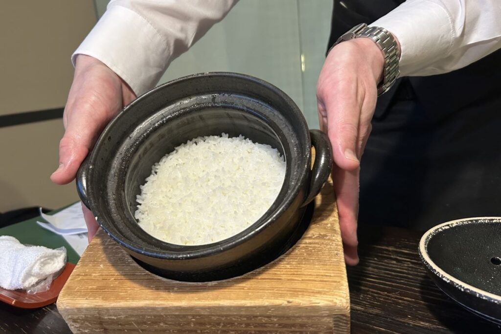 望楼NOGUCHI函館の自慢の一つが、釜炊きのご飯。厳しい品質基準を定め、食味の向上に力を入れる生産者でつくる「函館育ちふっくりんこ蔵部(くらぶ)」が育てた「ふっくりんこ」を、1組分ずつ、土鍋で炊き上げます。炊き上がりを見せてもらうと、大きめのお米の粒が一粒ずつ立ち、キラキラしています。固めに炊き上がったご飯は甘みはあるものの、味はあっさりしており、底にはおこげもできていて、香ばしさも感じます。