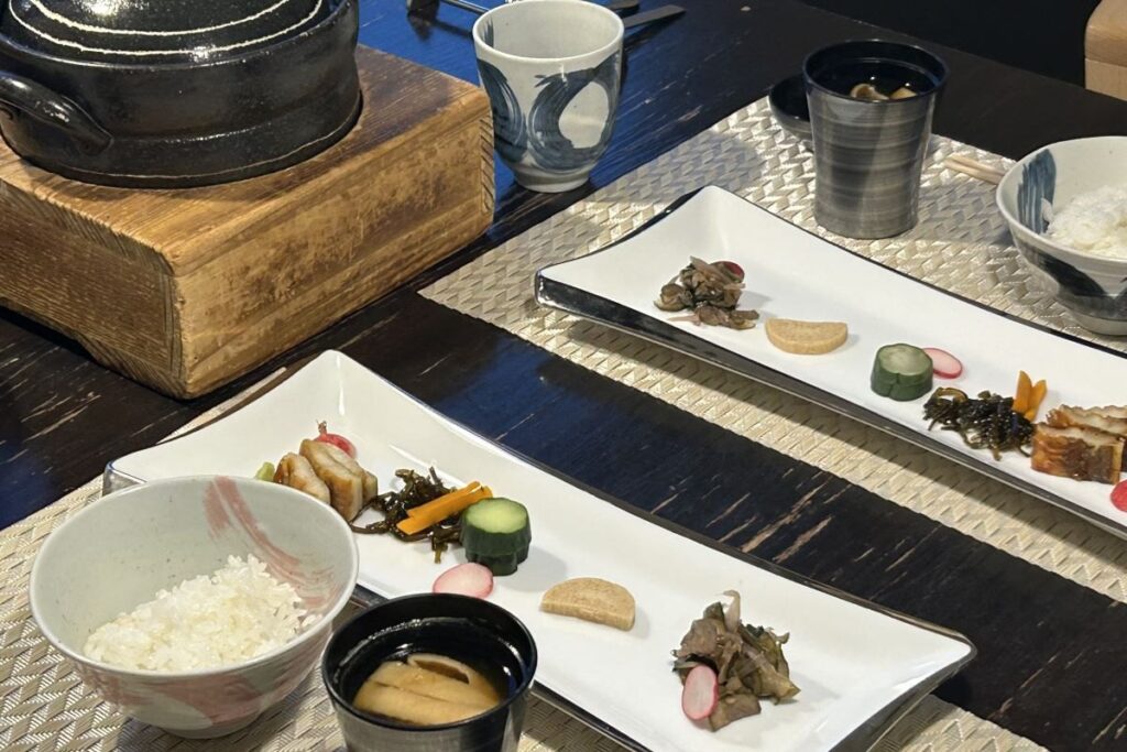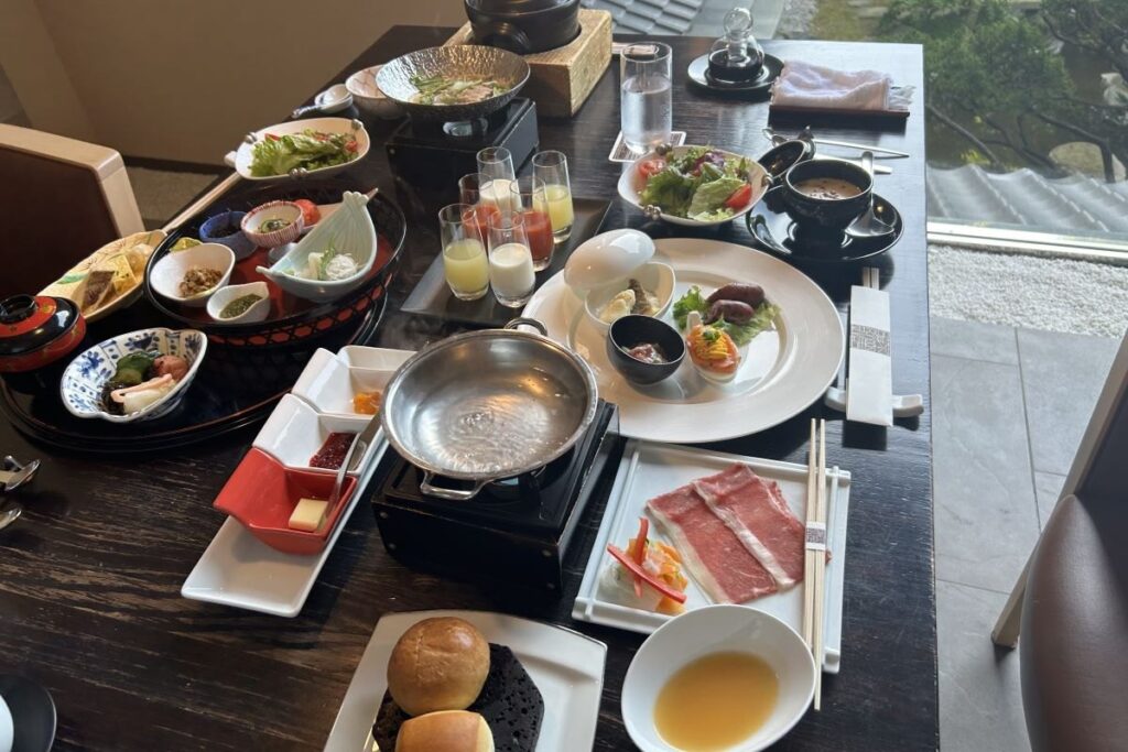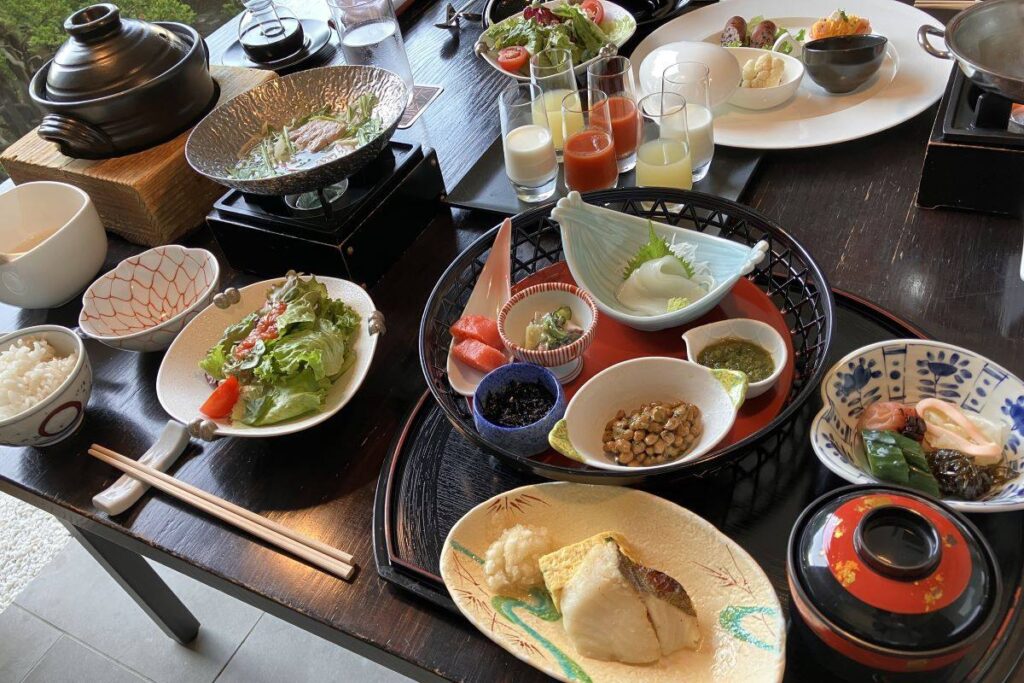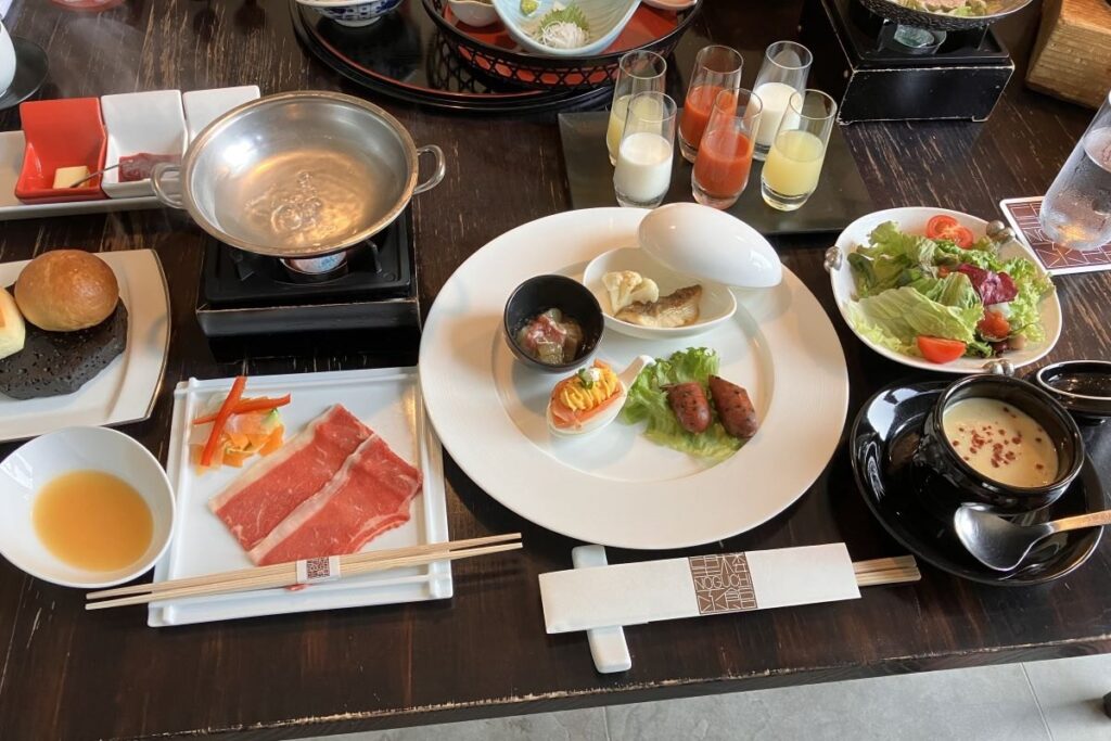 和食は、めかぶしょうゆでいただく函館産イカの刺身や知内産ニラ入りのだし巻き卵、ねぎま鍋、ホッケのつみれ汁、マダラの粕漬けなどのおかずが並びます。虎杖浜産のタラコ、函館のイカぬた和えなどのご飯のお供とともに、ホテル自慢のふっくりんこの釜炊きご飯が提供されます。デザートは、カボチャのプリンと白桃カツゲンのスムージーでした。