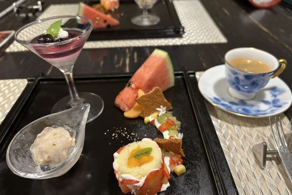 デザートは、「森町産ブルーベリーのカルダモン風味ゼリー」や大葉のジュレを添えた「北斗産トマト&チーズのカプレーゼアイス」、メロンを芯に巻いたロールケーキの表面をイチゴで飾ったフロマージュブランなどの盛り合わせです。