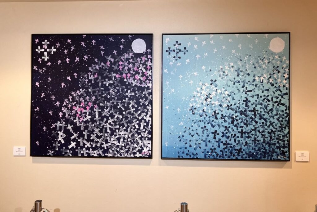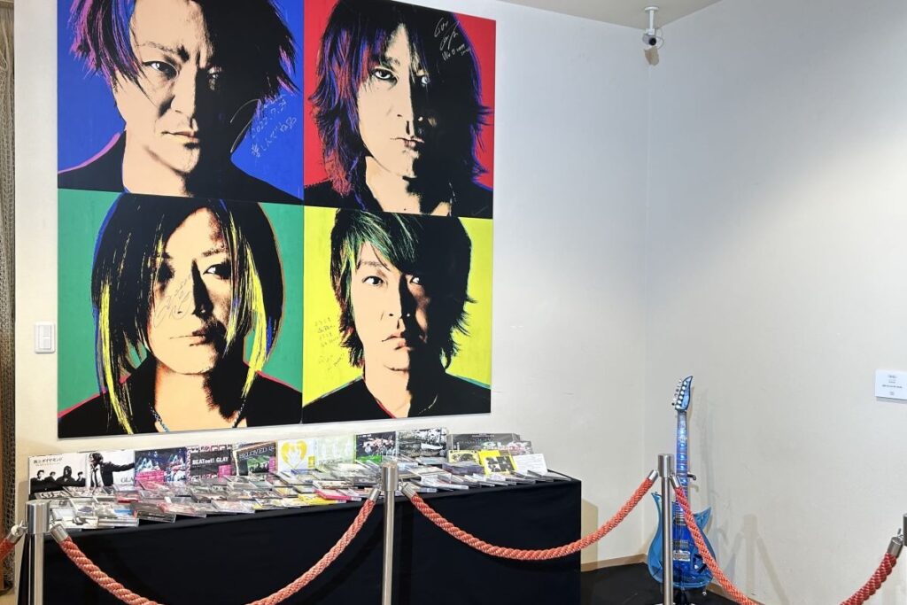HISASHIさんのギターなどを展示。TERUさんがこのショップの開店に合わせて描いた、函館の春の夜に舞い散る桜をイメージした「春夜(しゅんやく)」と月明かりに照らされて舞う粉雪を表現した「白夜(びゃくやく)」の絵画2点も飾ってあります。開店の時にサプライズで来店した