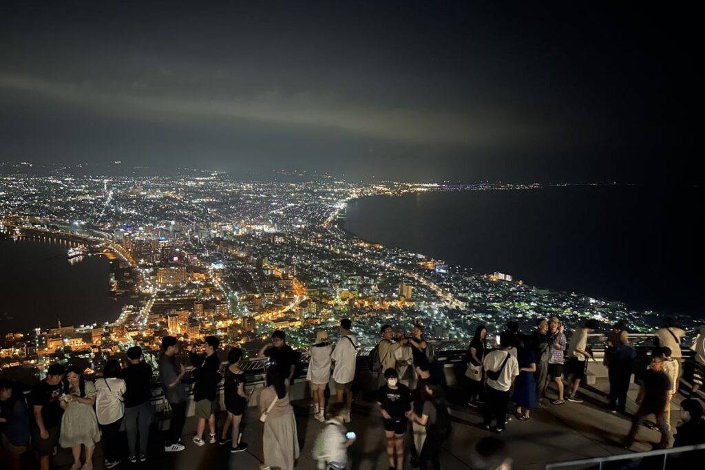 函館の夜の観光の目玉といえば、「世界三大夜景」とも言われる夜景です。「函館山ロープウェイ」に乗って標高334メートルの山頂を目指します。わずか3分ほどで、山頂駅に到着です。この日は少しもやがかかった感じでしたが、眼下に広がる「100万ドルの夜景」は圧巻。左に津軽海峡、右に函館湾が広がり、曲線状に光がちりばめられています。