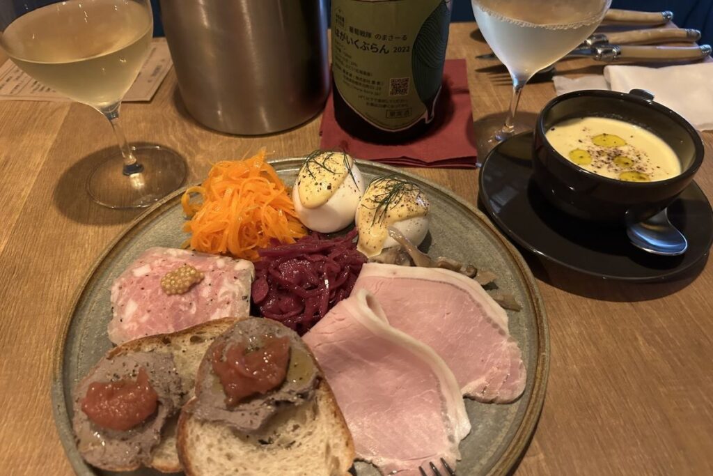 ワインのお供に、「定番盛り合わせ」をお願いします。予想以上のボリュームです。手作りのパテドカンパーニュやハム、レバパテ、キャロットラペ、紫キャベツのラペ、キノコのマリネなどがたっぷり。ウフマヨのマヨネーズは酸味を抑えたこっくりした味の手作り。紫キャベツのラペはクミンの香りがきいています。白老産の豚の自家製ハムは塩気が抑えめでしっとりした食感で、オーブンで火入れしているそうです。向井さんは「保存目的ではないので、それほど塩をきつくしていません」と話します。