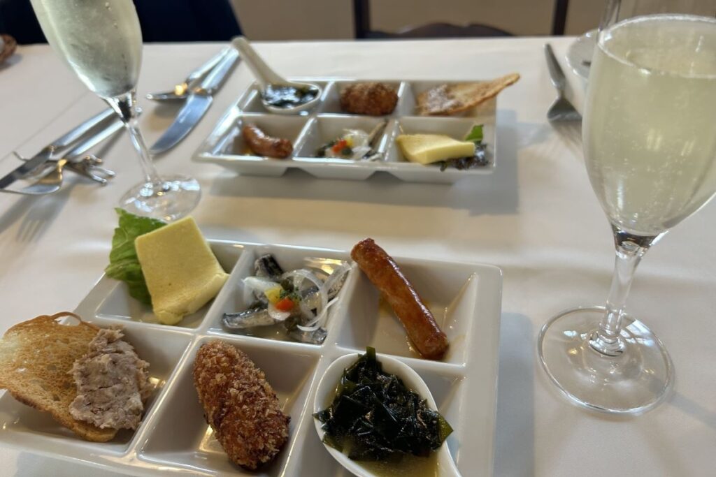 メーンのほか、サラダと前菜、スープ、パン、デザートが付くコースにします。ハンバーグの単品ランチや前菜なしのコース、自家製生ハムが付くコースなどもあります。前菜はピンチョス6品の盛り合わせを選びました。噴火湾産甘エビのクリームコロッケは、衣はサクサクで、ナイフを入れるとトロトロのクリームが流れてきます。南茅部産ワカメと自家製生ハムの煮物は、生ハムの塩気がシャッキリしたワカメの磯の香りを引き立てます。