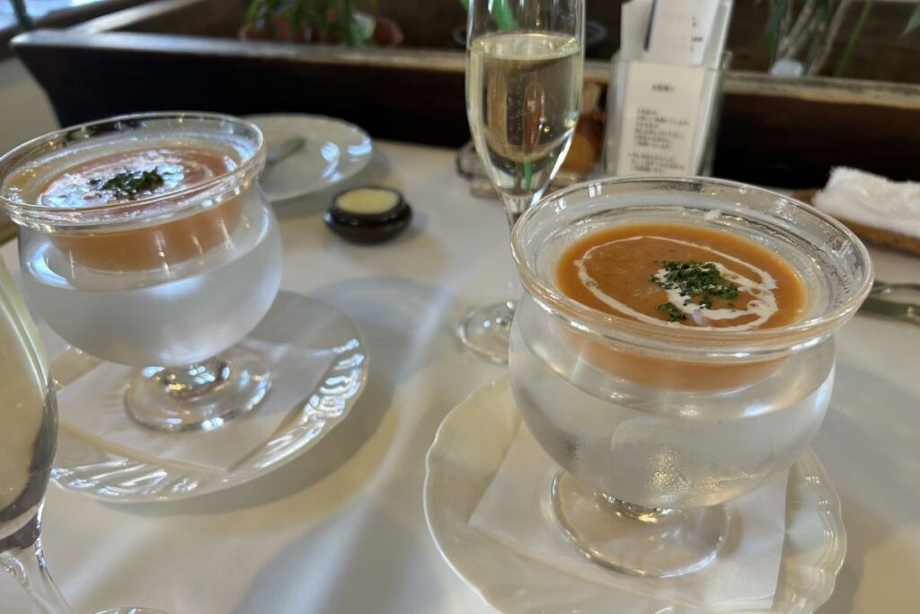 この日の気温は30度近く、スープは冷たいガスパチョ。氷の入った器にスープ入りの器を浮かべた涼しげな装いで提供されました。完熟トマトを使っているそうで、トマトの甘みと酸味のあるスープがさわやかです。ニンニクの香りもあり、野菜のうまみが溶け込んでいます。
