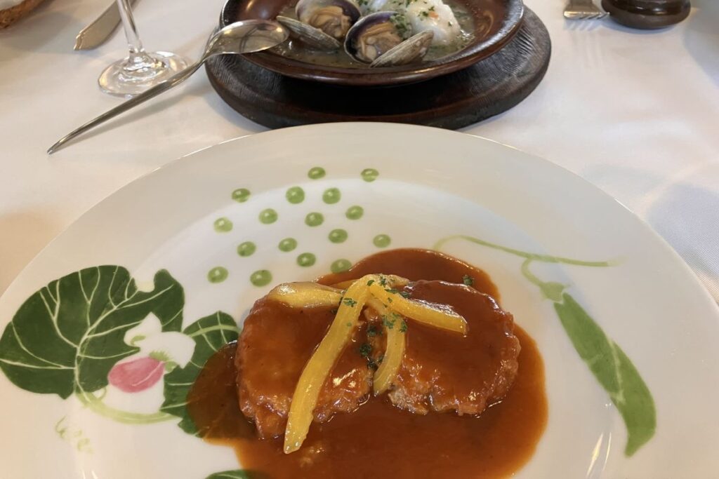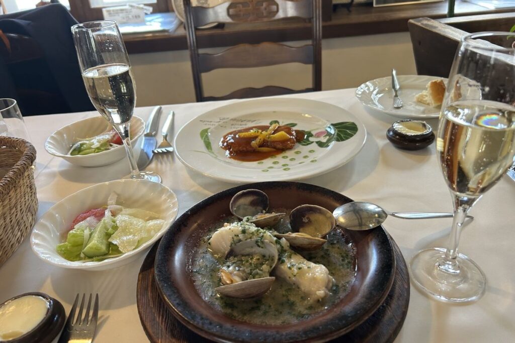 メーンは7種類の中から、「バスク」を冠したものをチョイスしました。「鱈のニンニクパセリソース」は、恵山でとれた1本釣りのタラを使用。たっぷりのスープをまとったアサリとタラの身が、熱せられたお皿でぐつぐつ煮立って提供されます。淡泊な味わいのタラの身に、香りの高いニンニクパセリソースがよく合います。パンですくって、ソースも残さずいただきます。「バスク地方特有の豚のゼラチン質だけを使った料理」は、豚の頭部のゼラチン質だけを集めてパテ状にし、トマトソースを合わせたバスク地方の郷土料理です。
