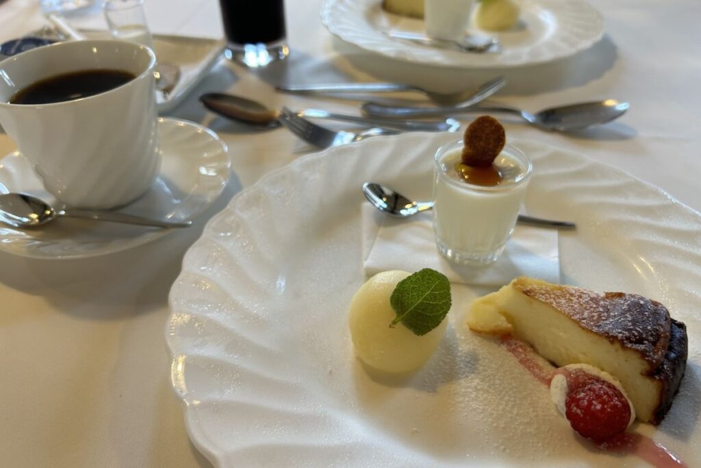 デザートのバスクチーズケーキには、レストラン裏の菜園でとれた木イチゴが添えられています。「スペインで食す冷たいお米のデザートからつくったムース」はクリーミーなパンナコッタのような味わい。水俣産の甘夏のマーマレーッドシャーベットで、口の中をさっぱりさせます。