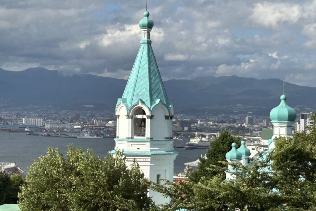 坂の下に白亜の壁に緑青(ろくしょう)の屋根をいただいたハリストス正教会の鐘楼が見えます。この春、2年間にわたる聖堂保全修理を終え、一般公開を再開しました。今回は、耐震工事など修復のほか、内部のイコンの洗浄・補修も実施しました。聖堂は国の重要文化財です。