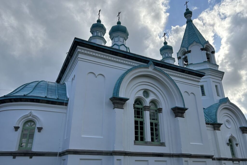 1860年(安政7年)、初代ロシア領事館の付属施設として建設された聖堂は1907年(明治40年)の函館大火で焼失しましたが、1916年(大正5年)に二代目聖堂が再建されました。聖堂内部は高い丸天井の下、イコノスタス(聖障)が張り巡らされ、イコン(聖像)が設置されています。外壁はれんが造りで、セメント・モルタルで固め、さらにその上にしっくいを塗ってあります。