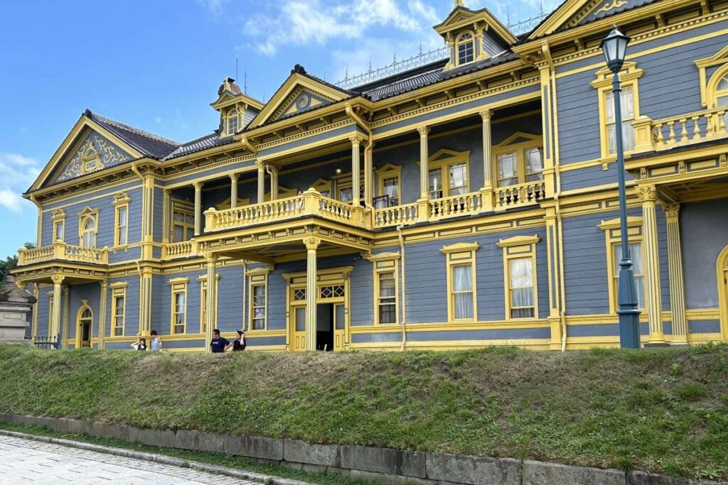 元町公園は江戸時代には「箱館奉行所」が設置され、その後、北海道庁函館支庁が置かれるなど、函館の行政の中心地でした。1909年(明治42年)に建てられた旧北海道庁函館支庁庁舎は、道の有形文化財です。柱廊玄関があるのが特徴で、2階に張り出した屋根が柱頭飾りと中央に膨らみのある大きな4本の柱に支えられており、凝ったつくりになっています。