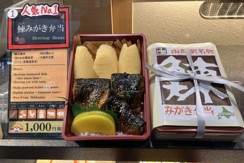 ショーケースの一番上の一番左、立ち食いそばなどの食券機でもポールポジションとなる場所に、ありました。「鰊みがき弁当」(千円)です。函館みかどは1936年(昭和11年)創業。鰊みがき弁当は66年の発売以来、一番人気で、売り切れてしまうことも多いそう。弁当に入っている鰊の甘露煮半身2枚入りのパック(750)円も販売しており、お土産にして、にしんそばやおつまみにも良さそうです。