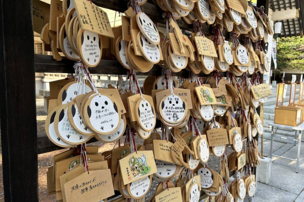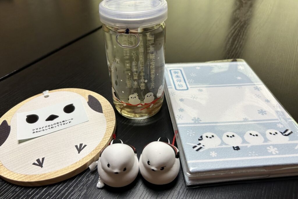 おみくじだけではありません。シマエナガの絵馬もあります。絵馬は願い事を書いた後、目とくちばしをシールで貼って完成させるオリジナルです。御朱印帳もシマエナガが仲良く枝に止まっているデザインです。新車のお祓いなどをお願いした際にいただけるワンカップの御神酒にもシマエナガが描かれています。