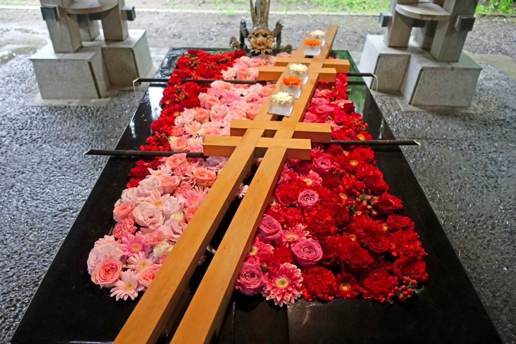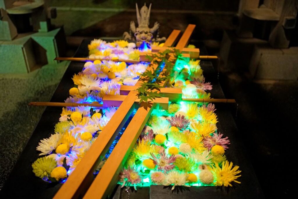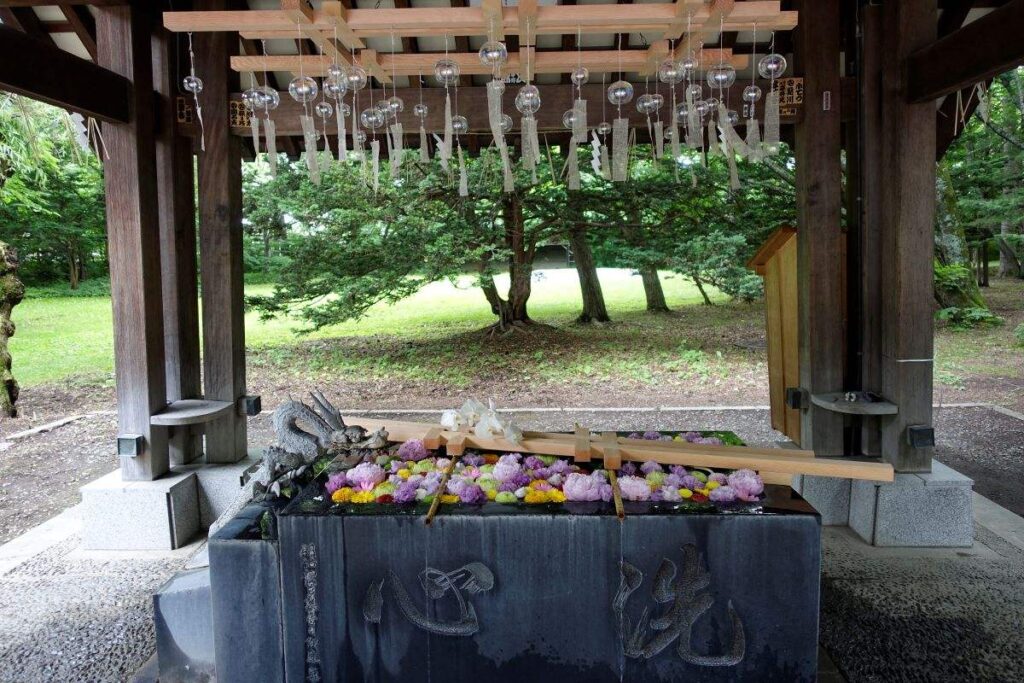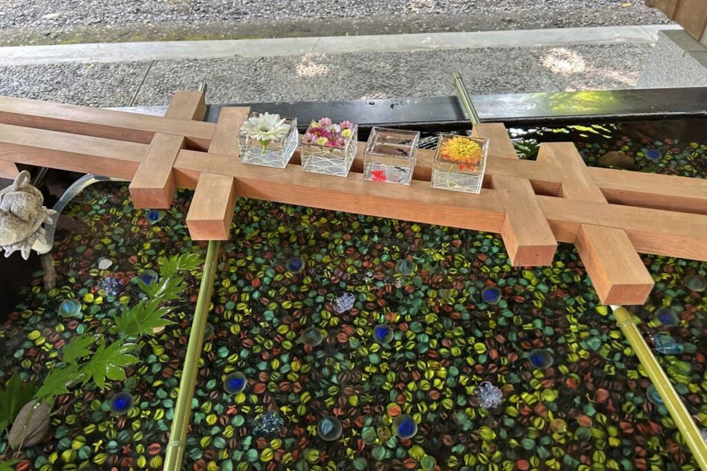 お参りの前に手を清める手水(ちょうず)。帯広神社は夏詣期間中、ここに花を飾る「花手水」を2019年から実施しています。伺った日はちょうど、入れ替え期間で花の代わりにビー玉で飾り付けされていましたが、権祢冝の佐々木昌和さんに写真を見せてもらうと、カラフルで華やか、おもわず写真を撮りたくなるかわいさでした。期間中、境内にある蹲(つくばい)や火鉢にも花を生けたり、隣接する十勝護国神社の手水もビー玉で飾ったりしているので、花手水巡りをするのも楽しそうです。