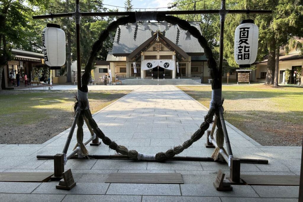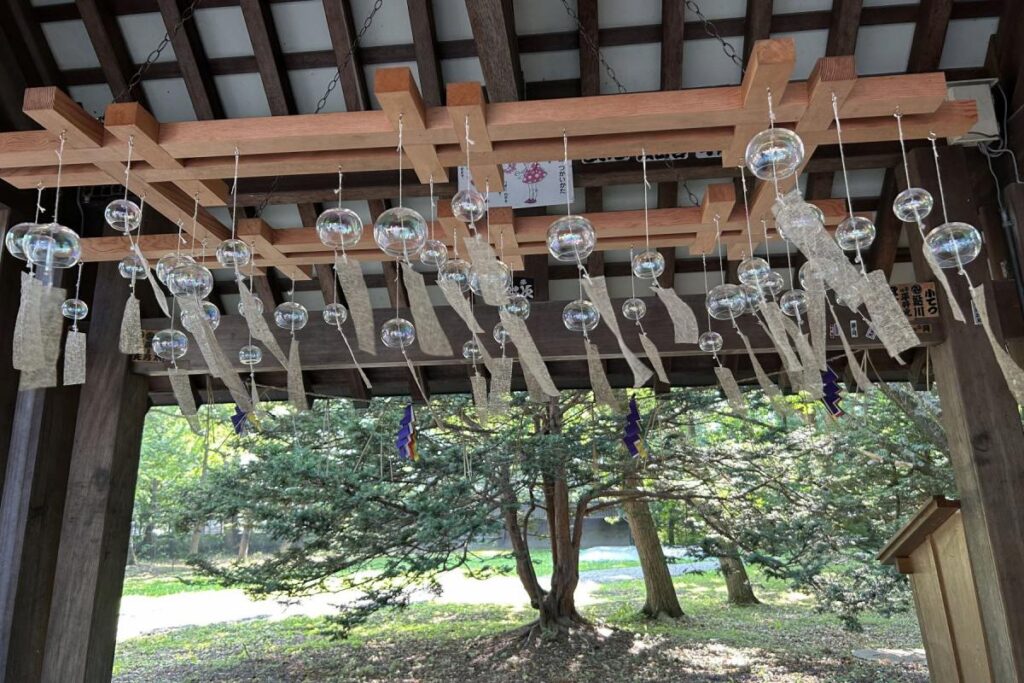 帯広神社では年始の「初詣」に対し、6月30日から8月15日までを「夏詣」と名付け、涼をとりながら参拝するよう呼びかけています。境内にはあちこちに風鈴が下げられ、涼しげな音が聞こえます。期間中、6月30日に大晦日までの半年間の健康、家内安全を祈願した「夏越(なごし)の大祓(おおはらい)」の茅の輪も設置してあります。