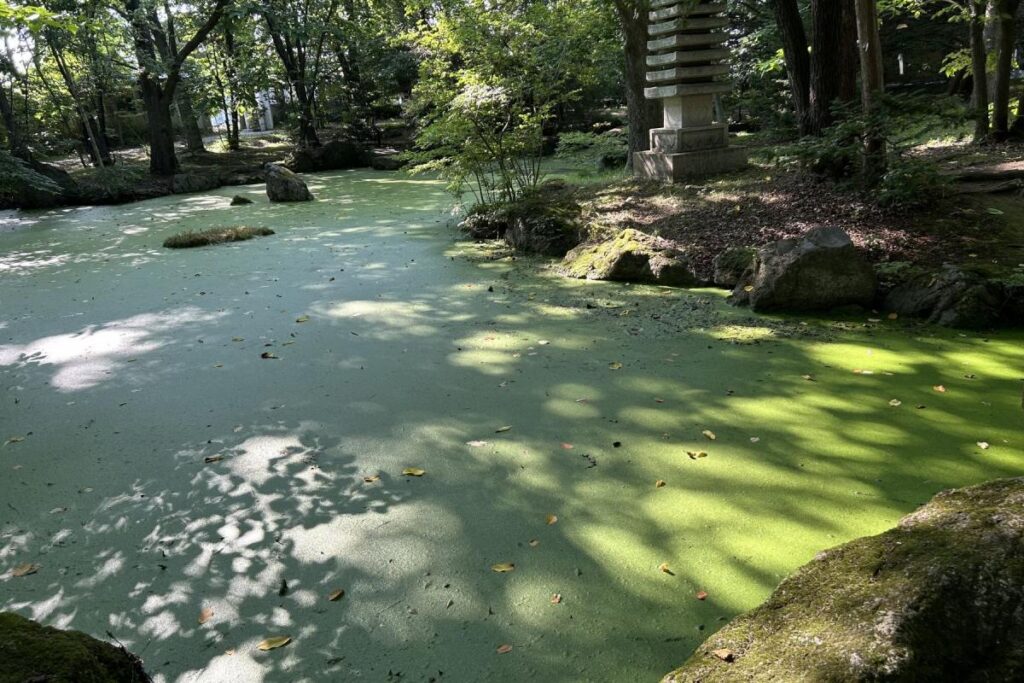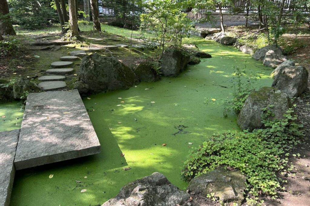 もうひとつ、不思議な場所があると佐々木さんが案内してくれました。「緑の池」です。名前の通り、水が抹茶のような緑色です。以前は透明な水でしたが、4~5年前から浮き草が繁茂し、こんな色になったとか。幻想的な雰囲気で、写真を撮りに来る人も多いそうです。例年、5月中旬から緑色が濃くなり、秋口まで見られるそうです。