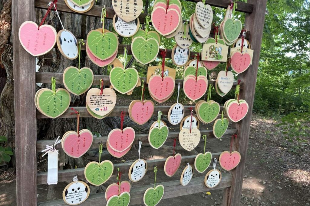 4月下旬から10月末の間のみ、授与される縁結びの絵馬があります。帯広神社の境内には、ハート形の葉が特徴のカツラの木があることから、カツラの葉が茂るこの時期だけの限定です。東側の休憩所の裏にあるカツラの木の前の結びどころに、たくさんのハートがぶら下がっていました。緑色とピンク色があります。普段は緑色ですが、満月の日だけはピンク色が授与されるそうです。