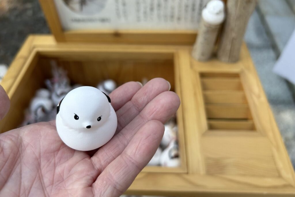 シマエナガのおみくじは、宮司の大野清徳さんの趣味のひとつが写真撮影で、境内でシマエナガを撮影していたことがきっかけで生まれました。冬になると群れで飛来し、樹木の葉もないため見やすいそうです。シマエナガをかたどった陶器の中に、おみくじ文が入っています。手描きのため、ひとつひとつ顔の表情が違うので、袋の上から確かめて、好みのシマエナガを探します。えいっと引いたら「吉」でした。おみくじはおみくじ掛けに結びつけ、シマエナガは連れて帰ります。