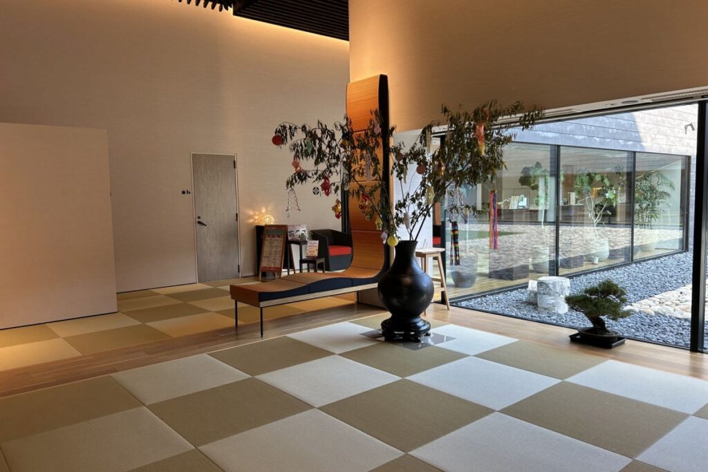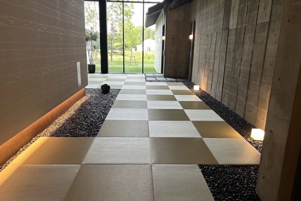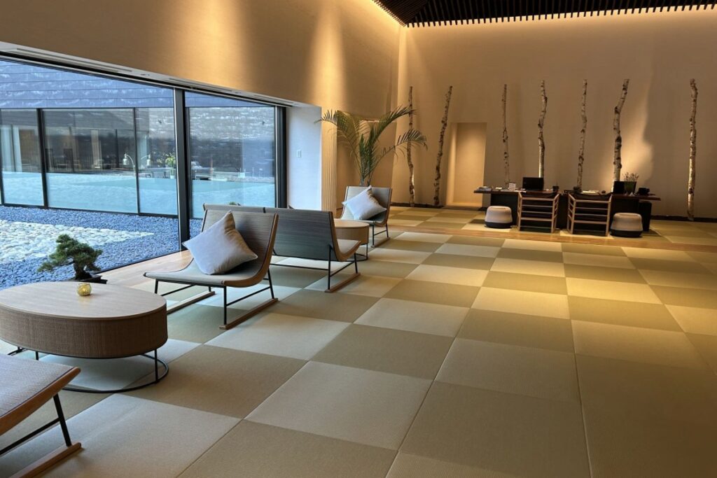 入り口でくつを脱いで上がります。ロビーや廊下、レストランを含め、館内はすべて琉球畳が敷かれています。建物は「ロ」の字型になっていて、中庭を囲うようにロビーやレストランがあり、その外側に各客室が配置されています。平屋建てですが、3階建てくらいの高さがあるそうで、天井が高く、広々としています。