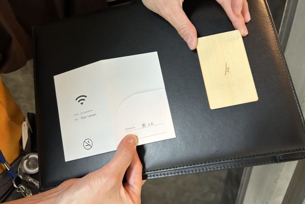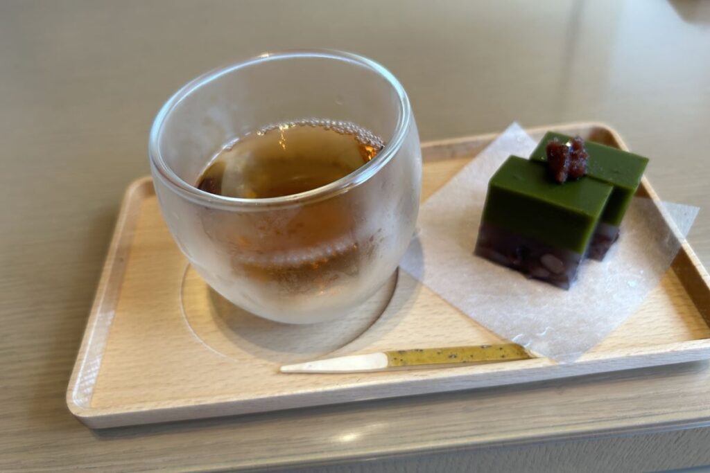 静寂房は、環境にも配慮しており、極力プラスチックの使用を控えているそう。ルームキーは竹製でした。部屋に入ると、仲居さんが冷たい麦茶とお菓子を出してくれました。抹茶小豆ようかんです。料理長の手作りとのことで、甘さ控えめであっさりしています。冷たい麦茶はポットにたっぷり用意されていました。