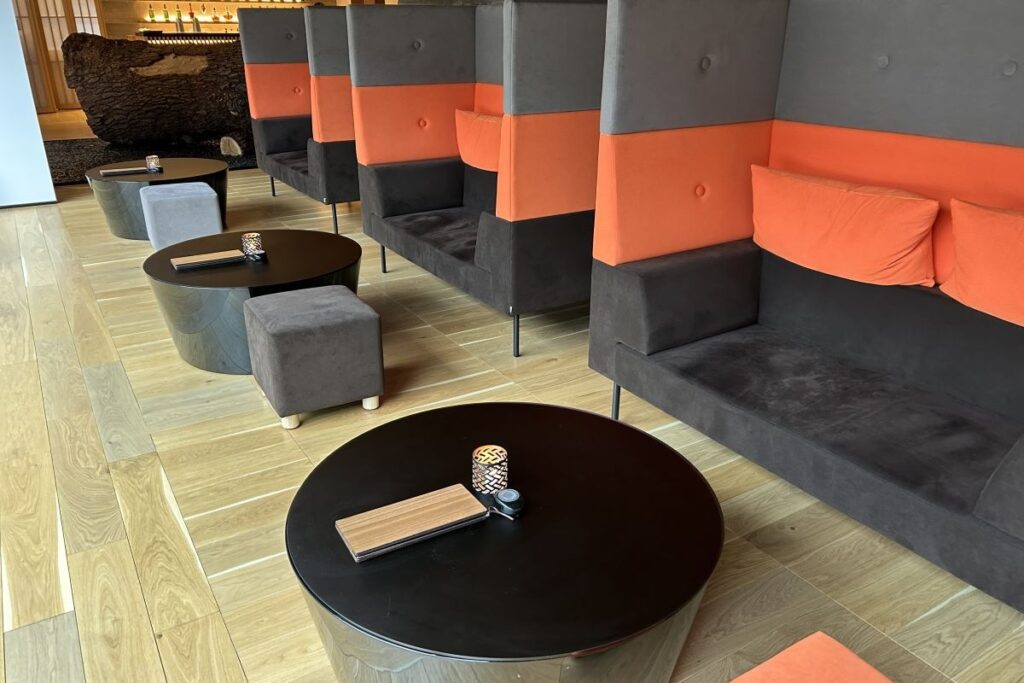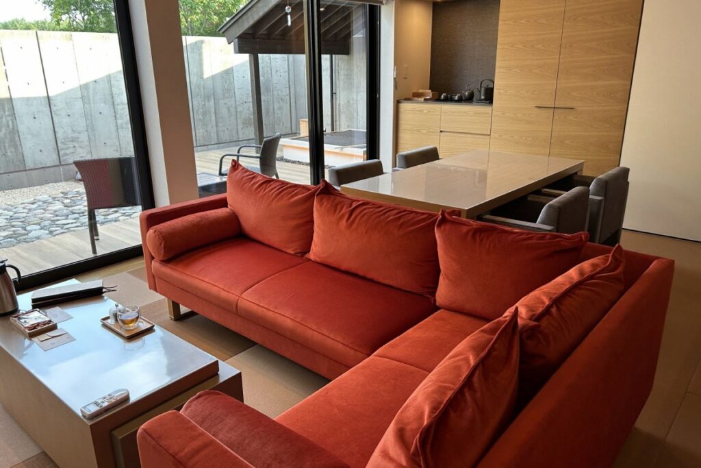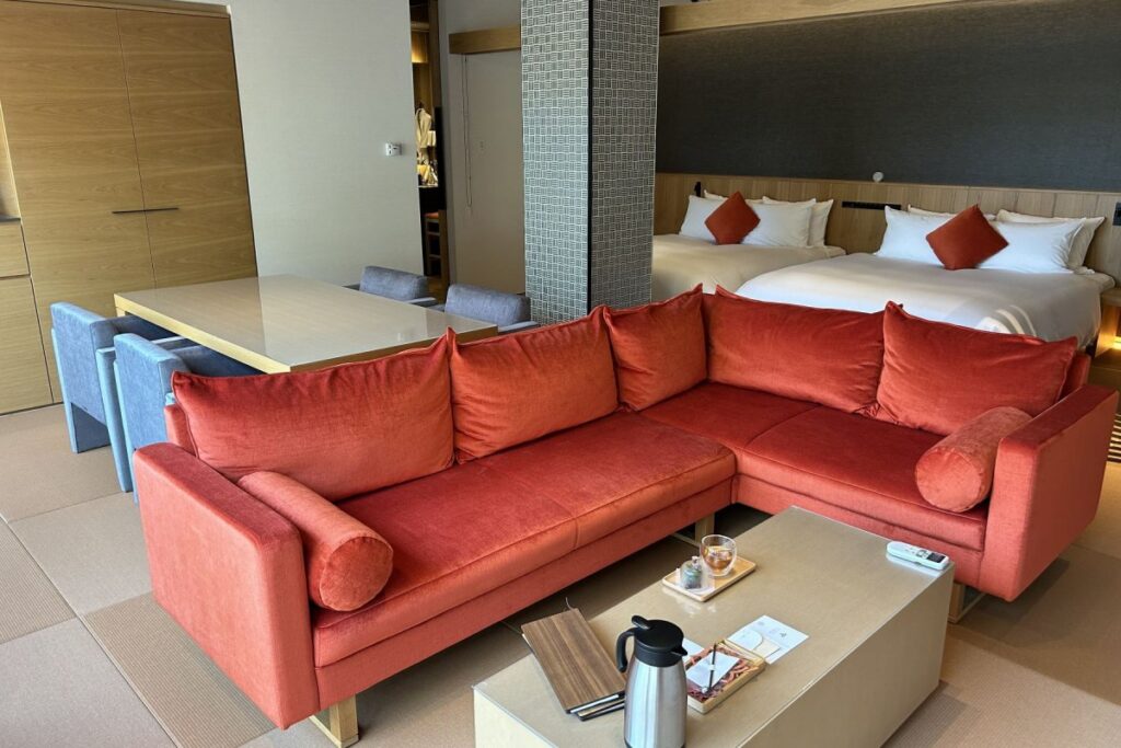 部屋に案内してもらいました。各部屋でデザインが違い、ソファなどの色も紺色や緑、グレーなど、部屋ごとに変えているそうです。各部屋とも50平方メートル以上あり、広々。案内されたのは「南2」の部屋。ソファやファブリック類は朱色で統一されていました。リビングダイニングとベッドルームがあります。
