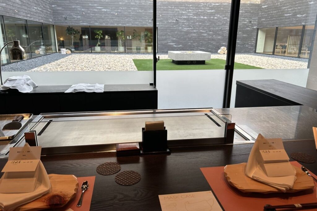 夕食は会席膳のほか、鉄板焼きも選ぶことができます。夕食時間前に、鉄板焼きのレストラン「十勝川」の席も見せてもらいました。和食のレストラン「和敬」と同様、窓からは中庭が望めます。鉄板焼のコースの後は、ソファ席でデザートが出されるそうです。