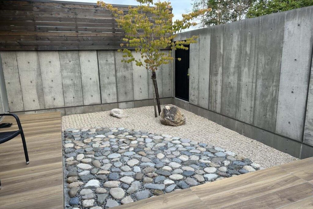 大きな窓の外には、枯山水を思わせる庭。高い塀で囲まれているのは、庭の一角に掛け流しの露天風呂があるからです。
