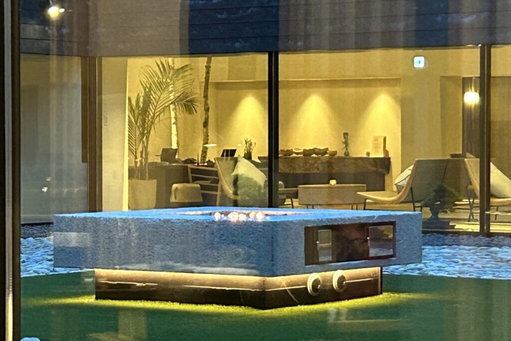 部屋で一休みしたら、夕食の時間。レストラン「和敬」で会席膳です。個室もありますが、中庭の見えるテーブル席にしてもらいました。1卓ずつパーテーションで仕切られ、女性1人でも周囲の目が気になりません。中庭の真ん中にある炉では火がゆらめています。
