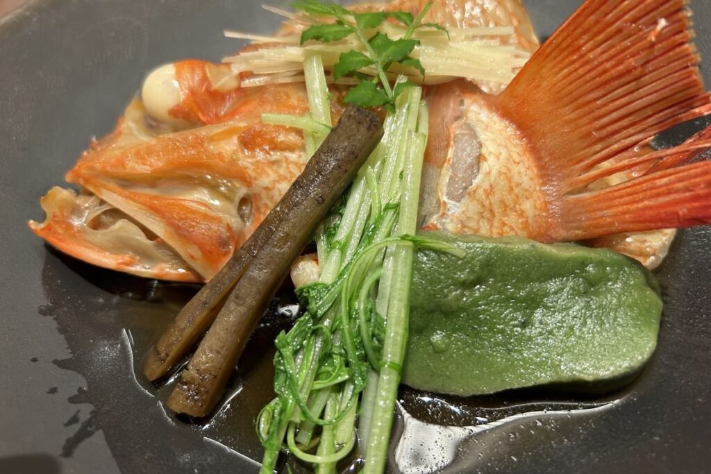 最初に食前酒としてキウイ酒が出され、先付はアスパラ豆腐です。前菜の盛り合わせはホタルイカの沖漬けやツブの肝和え、鮎の甘露煮など5品が品良く並んでいます。お造りは、アワビや本マグロ、海水ウニなどで、しょうゆのほか、昆布塩が添えられています。貝類と昆布塩がよく合います。さらに、身がしっかり詰まった毛ガニも一緒に出され、豪華さがさらにアップします。「きんきの旨煮」は、おかしらが半身どーんと盛られ、大きな切り身が2切ほど。脂がしっかりのっています。添えられたゴボウは十勝産。柔らかく煮付けられ、ほくほくした感じです。