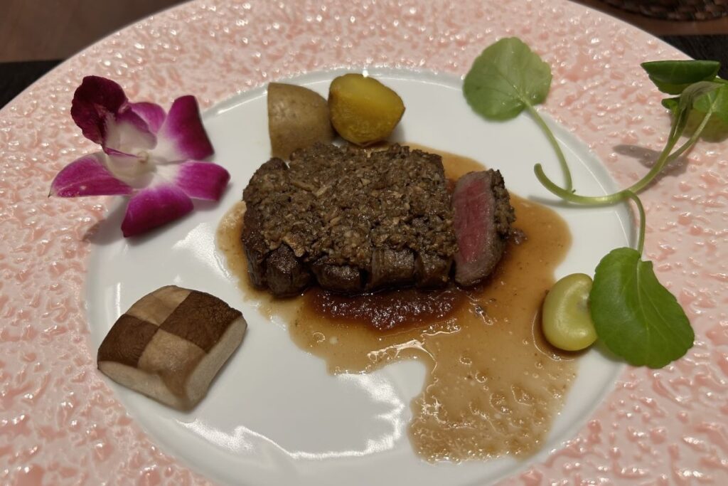 口直しのレモンシャーベットでさっぱりリセット。でも、ここまでで結構、おなかがいっぱいです。そこにメーンの「A5ランク十勝和牛フィレ肉のとかちマッシュ焼き」がやってきました。肉は柔らかく、レアに焼き上げられています。ブランドマッシュルームの「とかちマッシュ」をみじん切りにしたソースが敷かれており、香りが良く、おなかがいっぱいのはずが、はしが進みます。