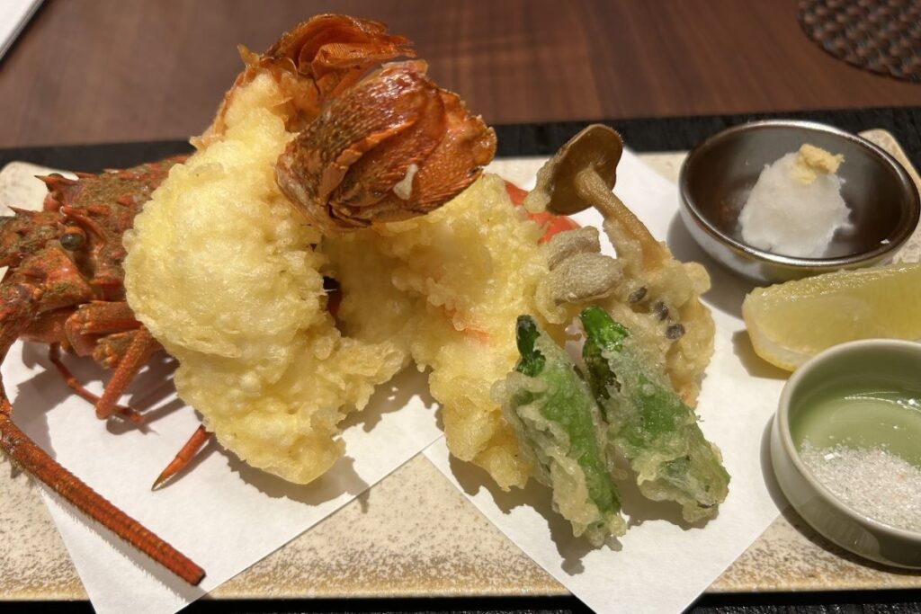 「ロブスターと野菜の天婦羅」はボリューム満点。ぷりぷりを取り越して「ブリブリ」なロブスターに、シシトウやシメジが添えられています。穴子の蒸し寿司は諸般の事情で(注・編集長のプロフィール参照)パスしてしまいましたが、デザートの「マンゴーソルベ フルーツ添え」はおいしくいただきました。