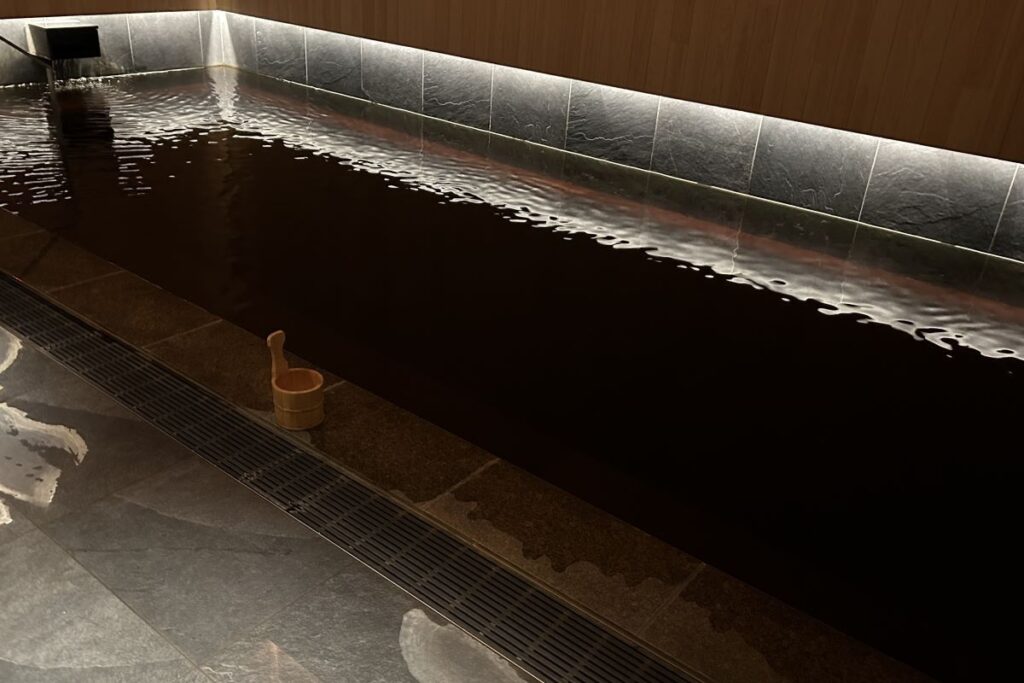 楽しみにしていた温泉を堪能します。大浴場は、運良くだれもいなかったので、写真を1枚ぱちり。サウナもあります。露天風呂もあり、上の方から外気を感じますが、目隠しの壁が高く、残念ながら外の景色は見えません。
