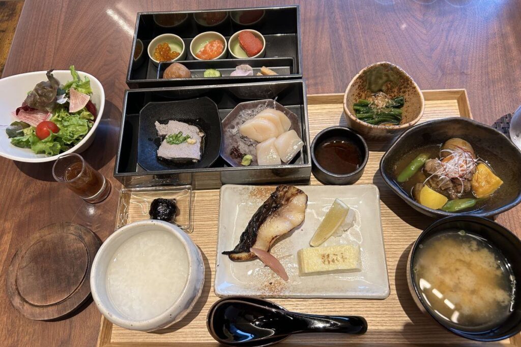 大きなベッドでゆっくり眠った後は、朝にまたお風呂。そして、朝食です。場所は昨晩の夕食と同じ「和敬」。最初に平取町のトマトジュース「ニシパの恋人」と余市町のリンゴジュース、道産のミルクが一口ずつ、出されます。ご飯はゆめぴりか。おかゆを選択しました。おみそ汁は道産シジミです。おかずは銀ダラの焼き物や牛すじ大根の煮物、ホタテのお刺身など盛りだくさん。ボリュームたっぷりです。