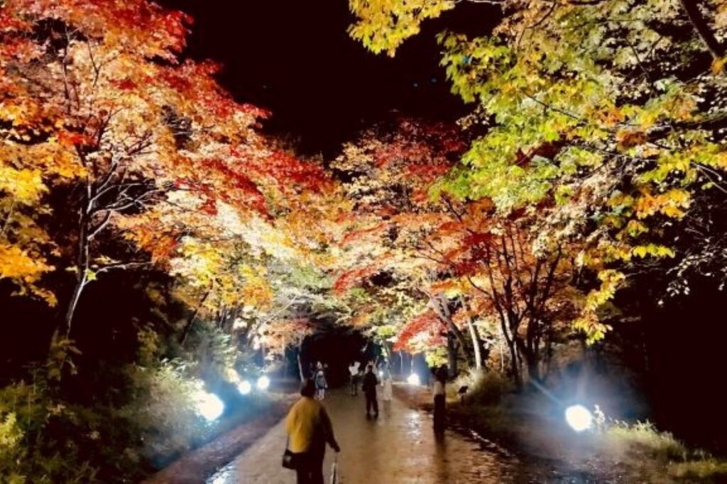 「日本一早い紅葉」を告げる大雪山の麓、大雪山国立公園・層雲峡温泉の温泉街の散策路「紅葉谷」で色鮮やかな紅葉のライトアップと人の動きに連動するデジタルアートで夜の紅葉狩りを演出します。