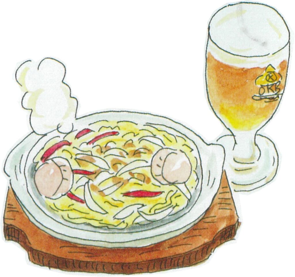 焼そばは北見のご当地グルメ・オホーツク北見塩やきそばだ。熱熱をハフハフする。地元産のホタテや玉ねぎ、しめじなどがのり、あっさり塩味でホタテのうま味がある。二 杯目はヴァイツェンを呑む。少し濁りがあり、うっすらとバナナの味がする。うまい。