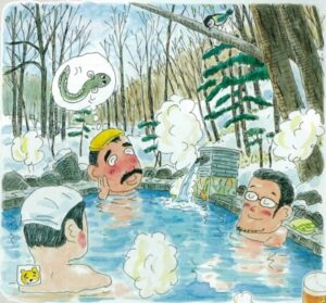 ここから車で約三十分、今宵の宿「塩別つるつる温泉」に到着。いかにも肌に良さそうな名だ。浴室は大浴場と竜神の湯の二つあり、源泉かけ流し。まず竜神の湯にざぶん。ザーッとあふれ、湯はドンドコ流れ込む。深さは約八十センチもある。無色透明でぬるめ。“塩別”といっても塩っぱくない。体を沈めて「なんだこりゃ」肌 がぬるりとする。アルカリ性分が多いので、かなり強いつるりん感があり心地好い。やわらかな湯は美肌に憧れる今様温泉女子が喜びそう(温泉婦人も)。