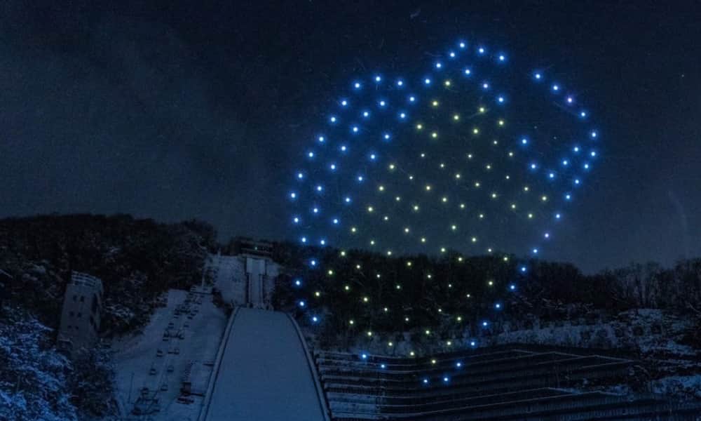 「ドローンショー・ジャパン」(本社:石川県金沢市)が担当。全国各地でドローンによるエンターテイメントショーを披露しています。今回は自社制作ドローンを操縦。 LEDライトを複数個装着したドローンがプログラミングによる編隊飛行で「ビール」や「スキー」、「ラーメン」などを表現。「北海道」を夜空に描きます。