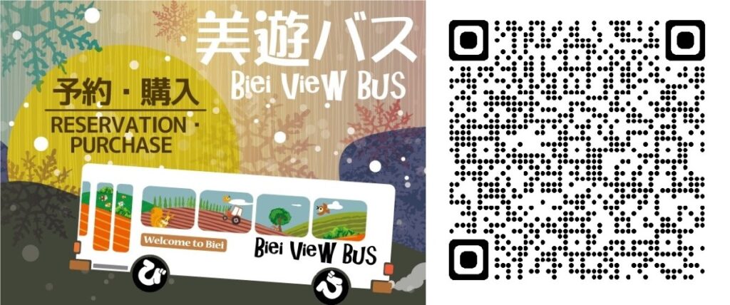 美瑛町内の人気観光スポット、白金エリアの”白ひげの滝”や”白金青い池”などをバスで移動しながら巡ることができる周遊バス。9月30日までは青い池・花畑 コースで、毎日運行。申し込みはQRコードか美瑛町観光協会HPで。