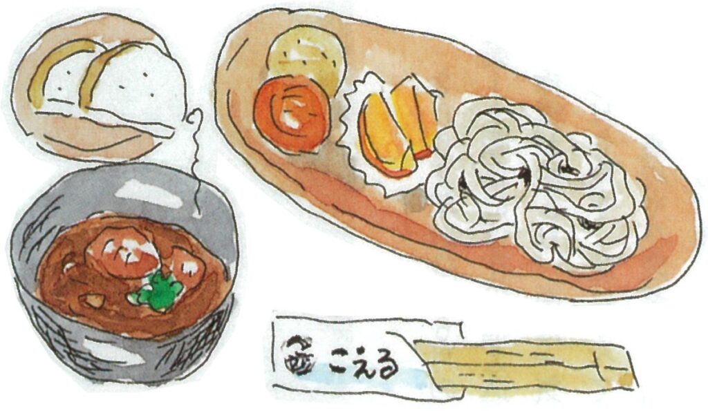 旅先でのおいしいものは「地産地消」が いい。そこでぼくは、うどんをすすりながら「地産地食」ということばを考えた。その土地の物をその土地でモリモリたべる幸せ。でもこのカレーを、ちょっとだけごはんにかけてみたい気がしてきた。(ごはん下さい)と言おうかなあ。