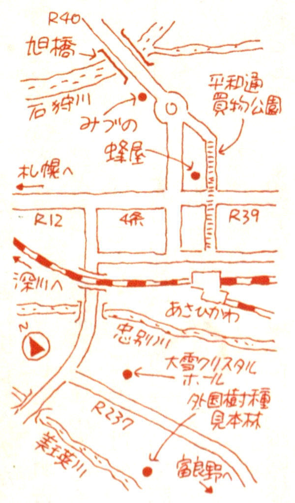 ナナカマドの赤い実がゆれる街並。旭川駅に戻り、駅前のだるまや(現在は旭川市2条13丁目に移転)で買った焼きたてのバナナ焼とたい焼をたべながら、平和通買物公園から旭橋にむかう。商店街をぬけると寒さがつのる。 もう一杯ラーメンをたべようと、途中ラーメン店みづのに寄り、月見生姜ラーメンをふうふう。チャーシュウがうまい。キレのいいおろし生姜入り豚骨スープをズビーッと飲み干す。(ああ、これまたカロリーオーバー)。冷えた胃袋がホイーッとあたたまる。